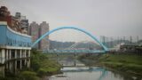 橋と要塞が見える変わりやすい天気の川辺風景