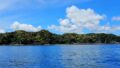紫色の雷雲と椰子の木越しに落ちる稲妻